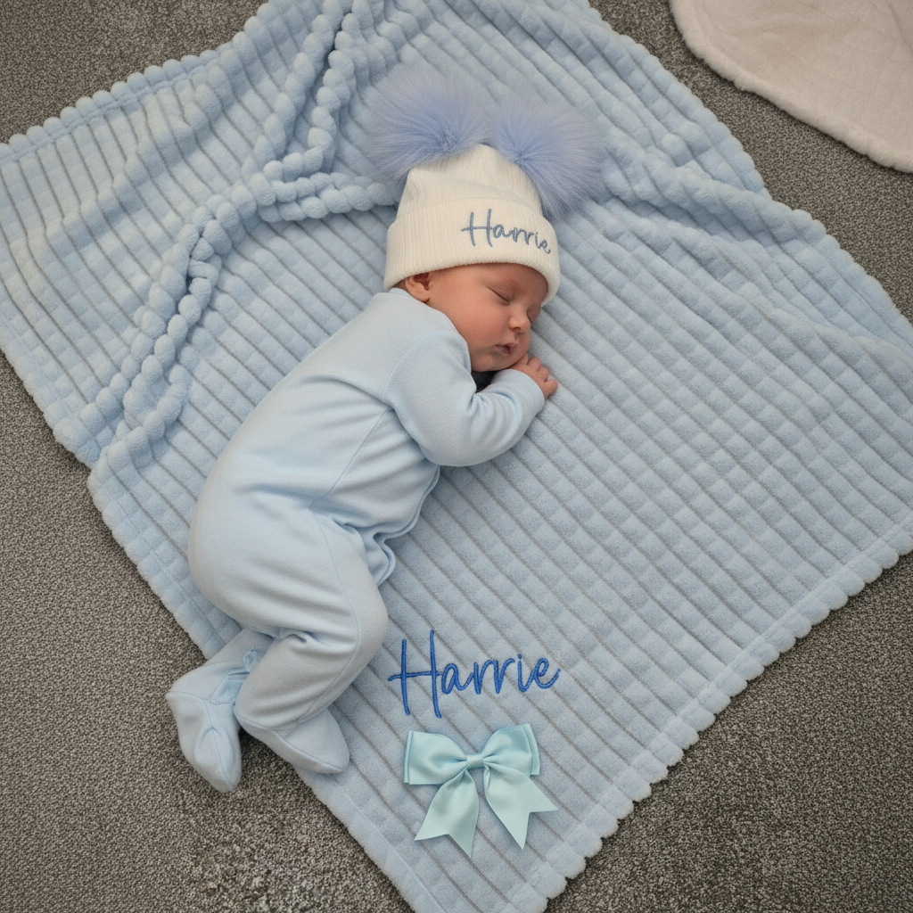 ✨ Personalised Ribbon Blanket & Pom Pom Hat Set ✨