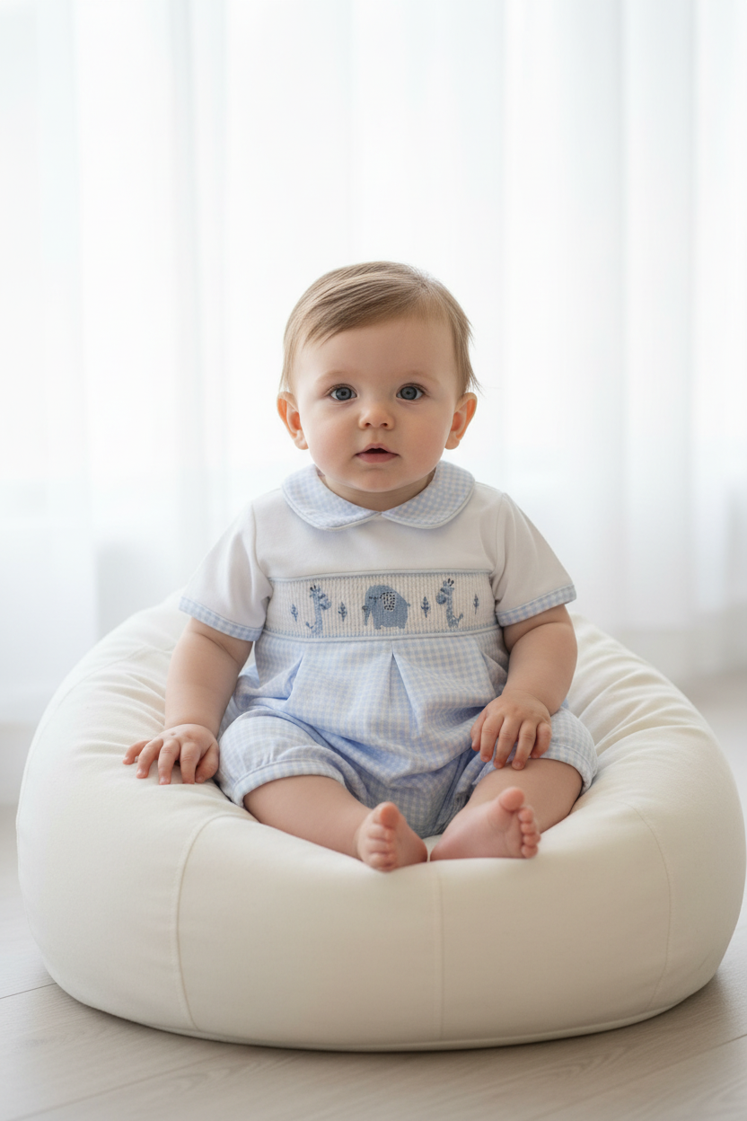 An absolutely adorable piece for your little one! This delightful romper features a classic pale blue gingham check design beautifully finished with exquisite smocked detailing and sweet embroidered elephants.
