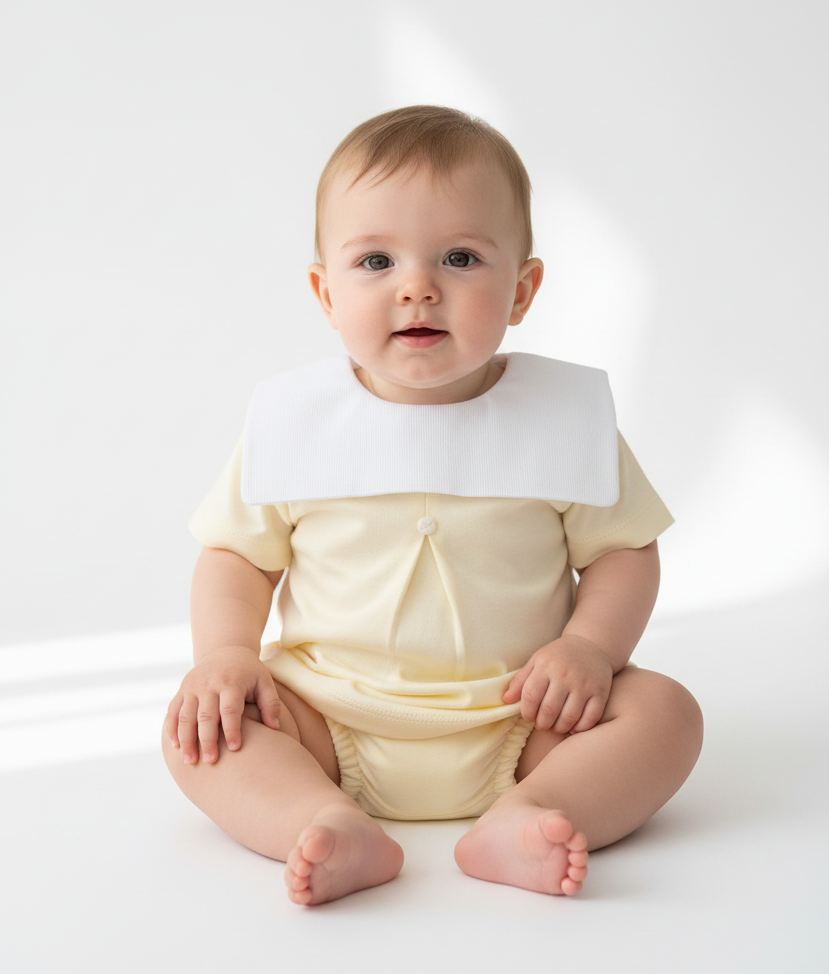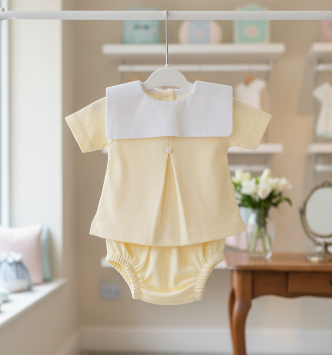 This versatile set pairs beautifully with white or tan leather shoes for formal occasions, or simple socks for everyday charm. The cheerful lemon shade complements all skin tones and photographs beautifully in natural light. A timeless piece that will be treasured in family albums for generations.