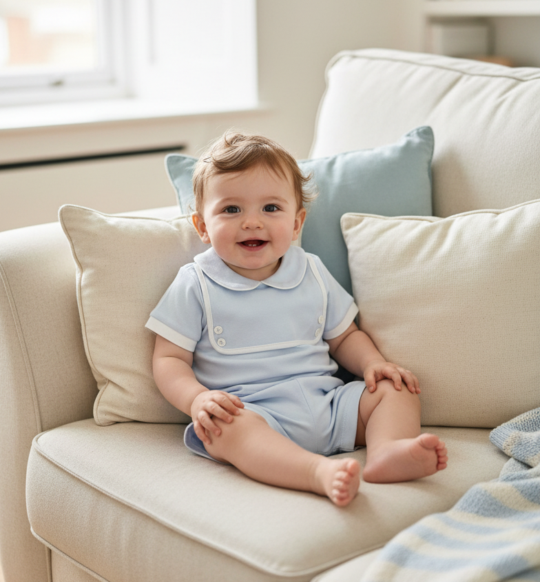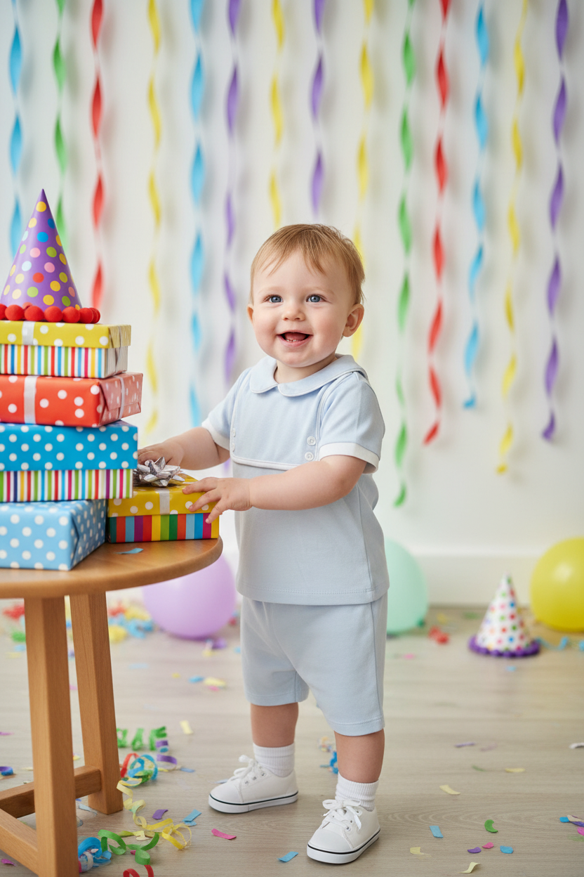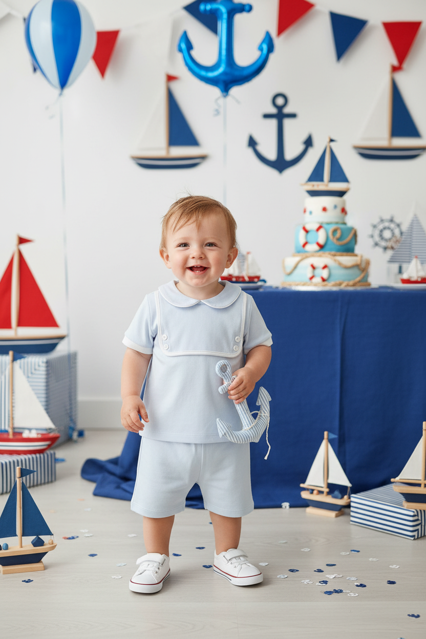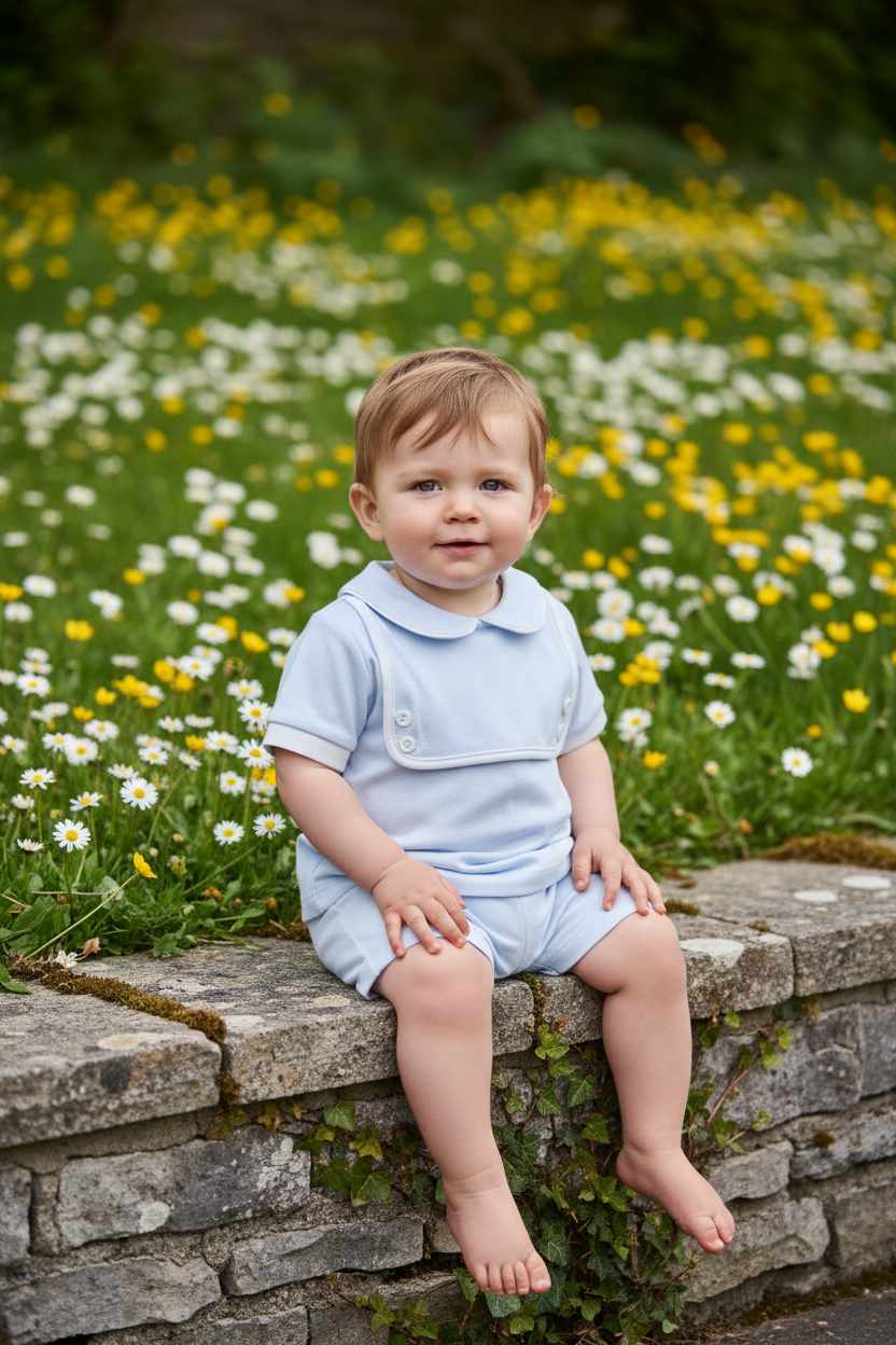 Crafted with exceptional attention to detail, this exquisite boys' sailor-style outfit combines classic charm with premium comfort. Made in Portugal from the finest soft cotton, this two-piece set features a sophisticated pale blue with elegant white piping and a traditional Peter Pan collar.