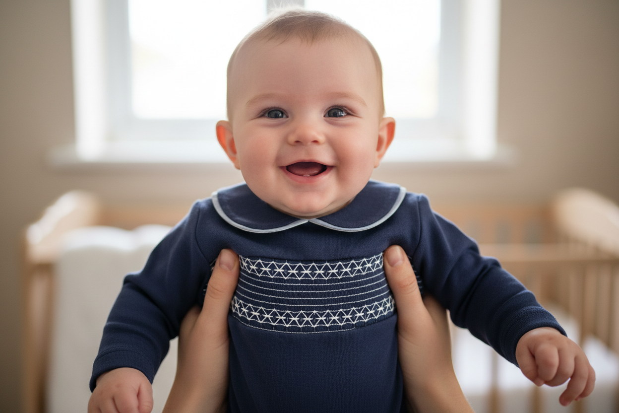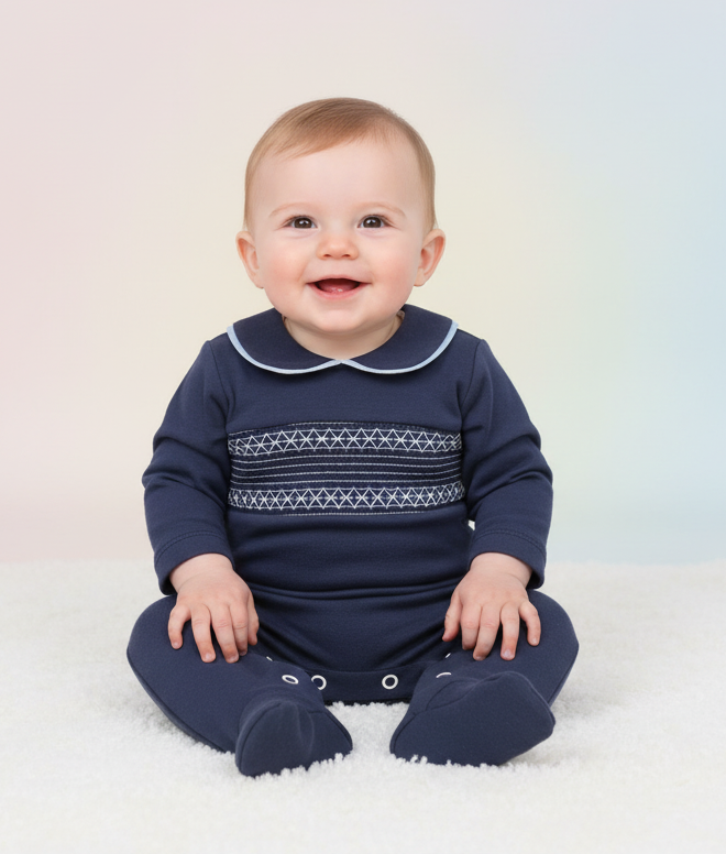 Beautifully crafted in 100% soft cotton, this navy blue smocked romper combines timeless elegance with exceptional comfort for your little one. Featuring traditional smocked detailing across the chest and a classic white Peter Pan collar, this premium babygrow is perfect for special occasions or everyday luxury.