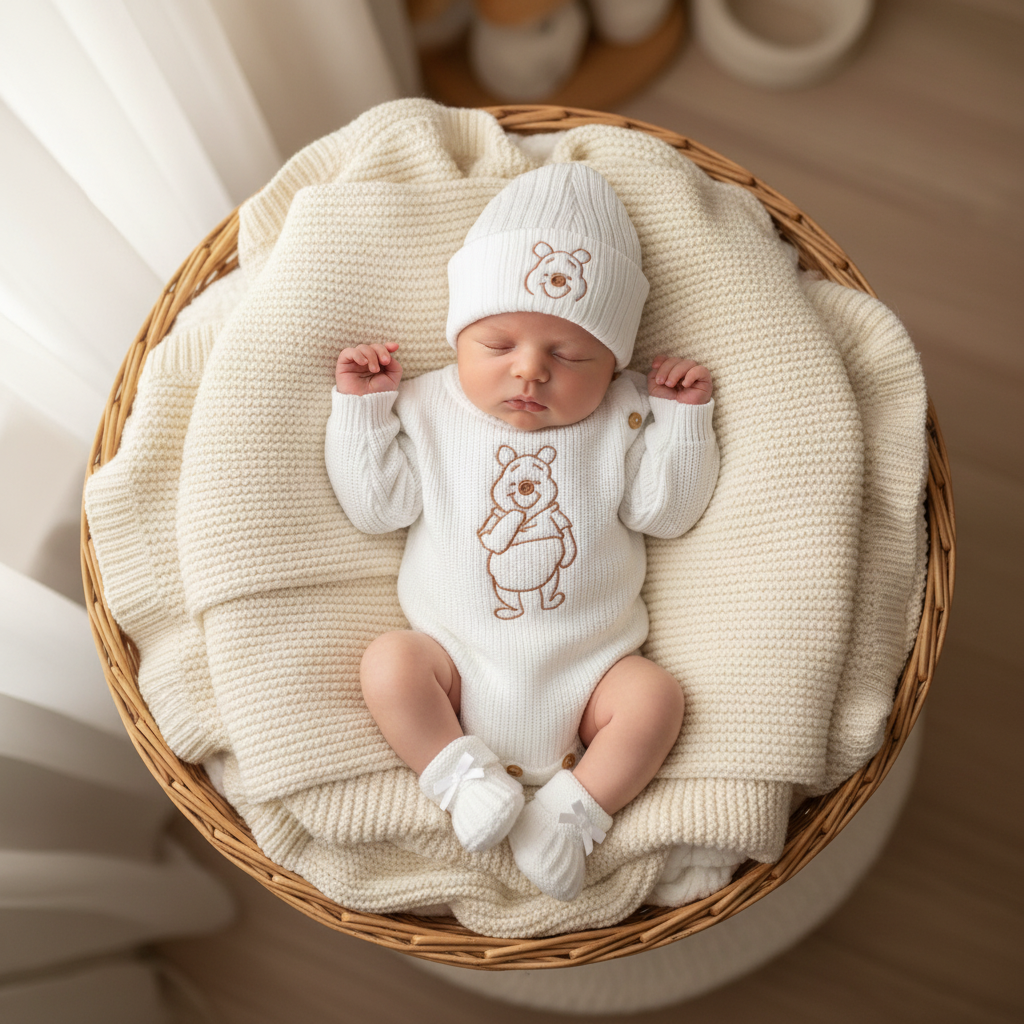 Dress your precious little one in timeless elegance with this exquisite white knitted romper and hat set, featuring the beloved Winnie the Pooh character. Crafted by Dandelion Baby with exceptional attention to detail, this premium outfit is perfect for newborn photoshoots, christenings, special occasions, or creating treasured keepsake moments.