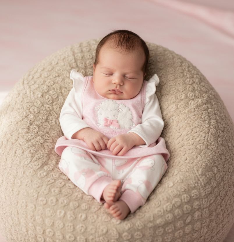 Baby in pink sheep outfit - beige beanbag nestled