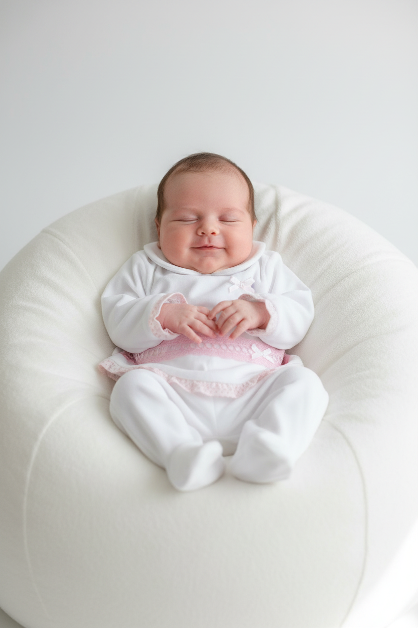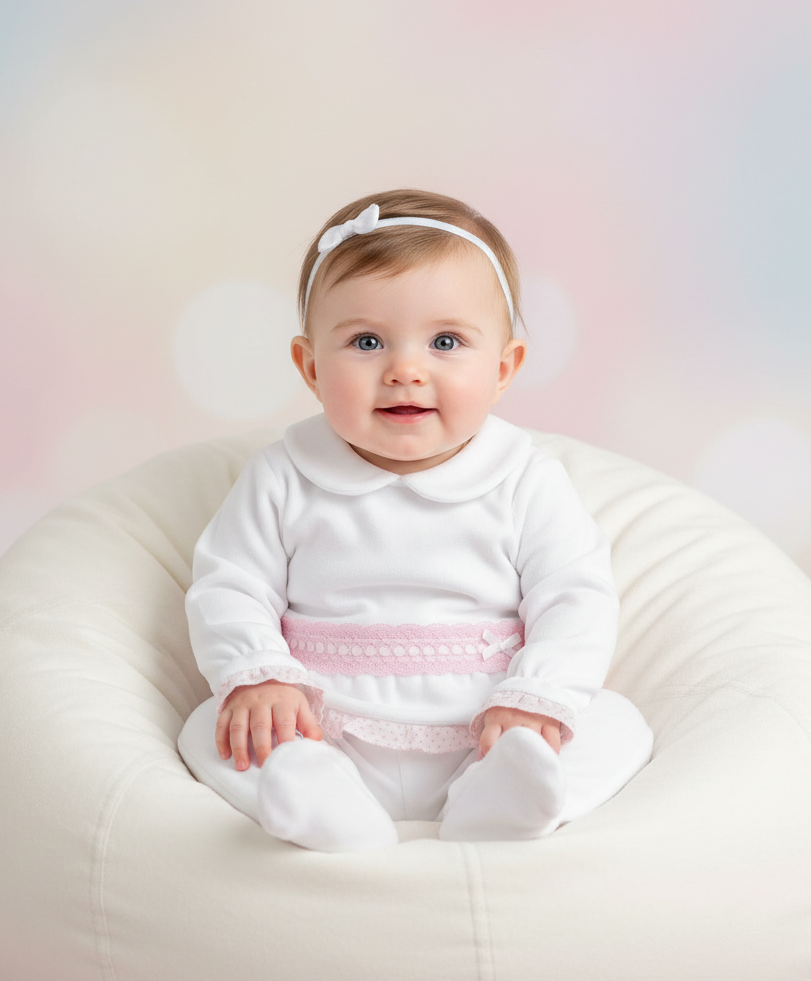 This beautiful white two-piece set features delicate pink lace trim and a traditional Peter Pan collar, crafted from luxuriously soft velour that's gentle on delicate newborn skin. The coordinated top and footed trousers create a timeless, keepsake-quality outfit perfect for special occasions, family photos, or welcoming baby home.