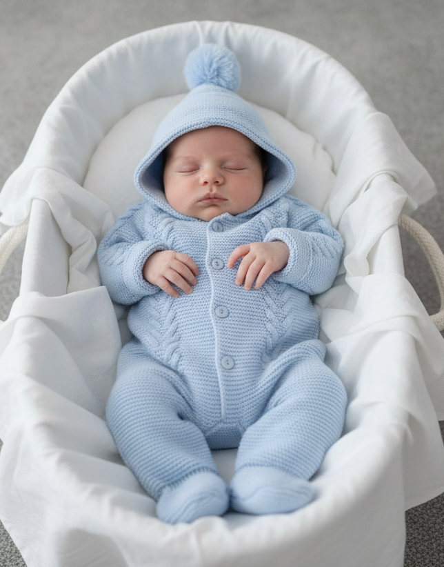 Blue suit in Moses basket
