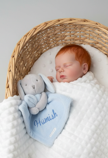 This luxurious set features an ultra-soft blanket and adorable bunny comforter, both custom embroidered with baby's name in elegant script. Perfect for the nursery, pram, or as a thoughtful gift for baby showers and newborn arrivals.